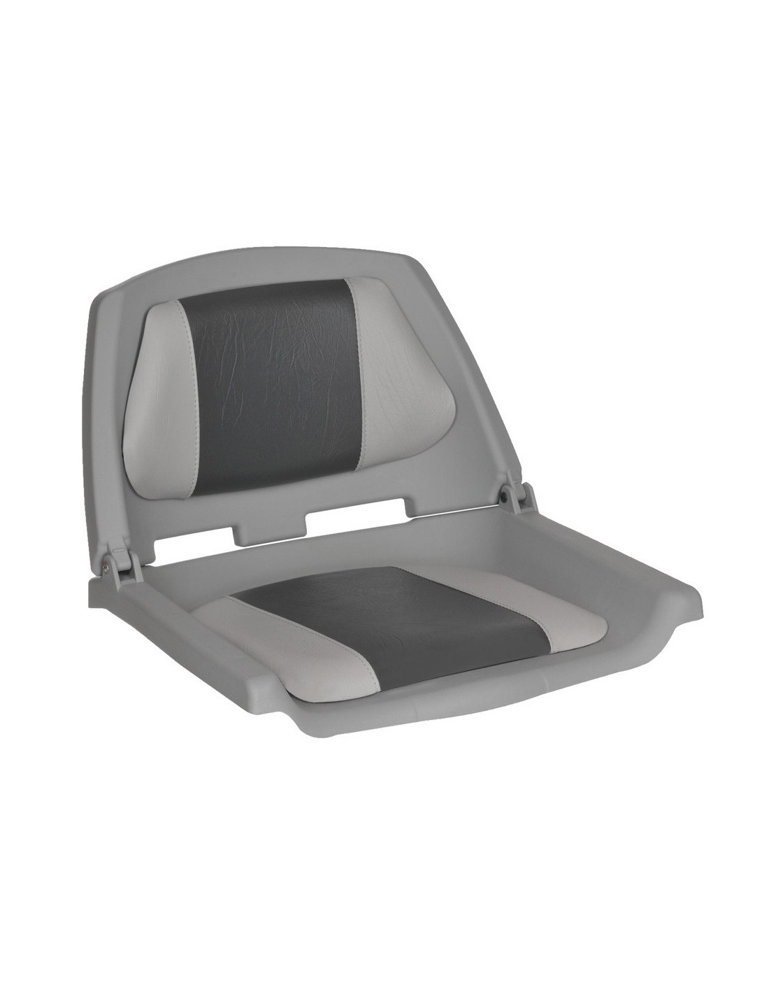 Asiento plegable de PVC, con revestimiento tratado ante UV que resiste deterioro y tapiz acolchado de 3 paneles, para base giratoria estándar 7". Color gris claro y oscuro.