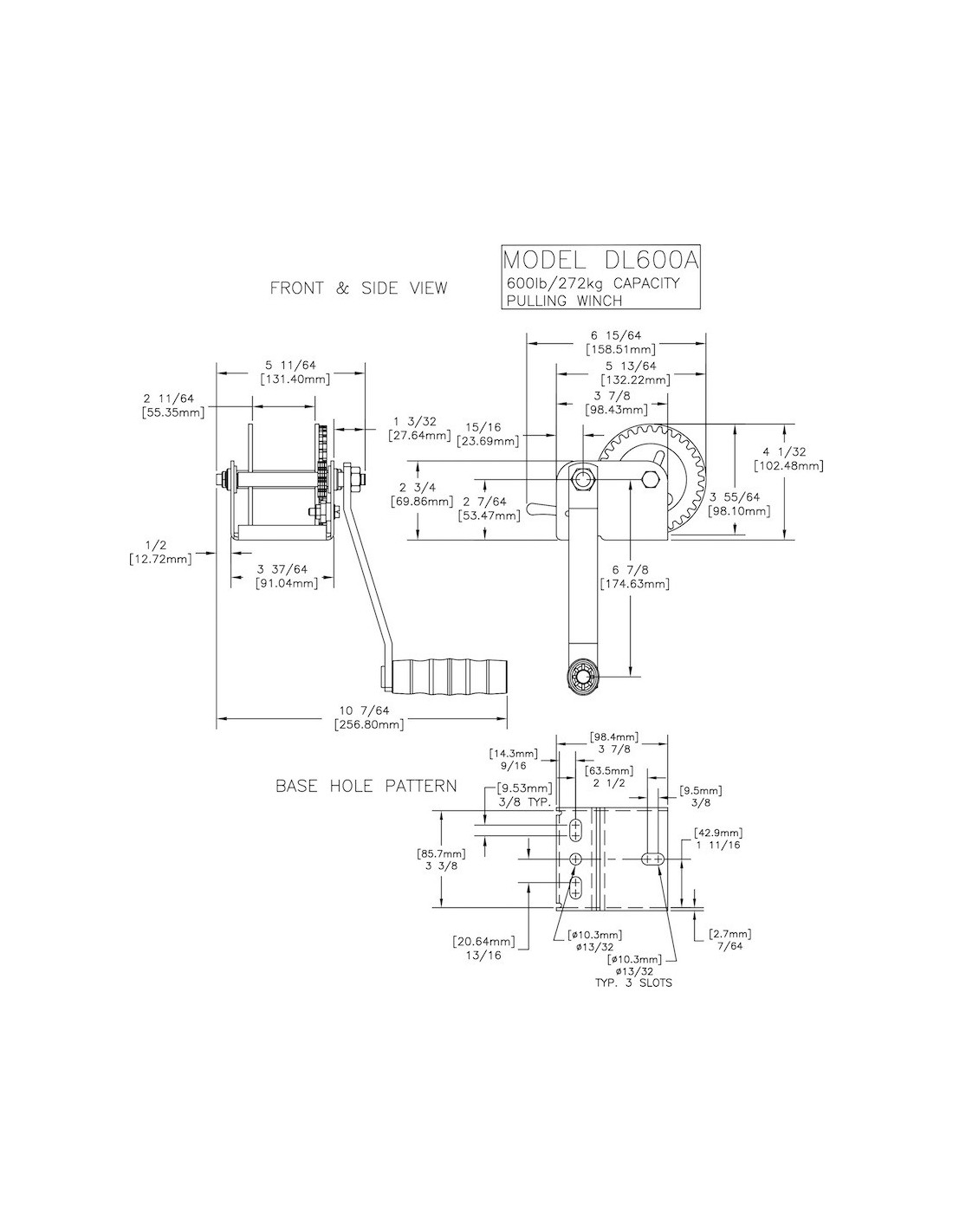 Winche de 600 lb para aplicaciones de tracción horizontal. Engranajes de acero al carbono, rodamientos lubricados permanentemente y empuñadura ergonómica. Acabado TUFFPLATE Zinc. Manilla incluida. No incluye correa.