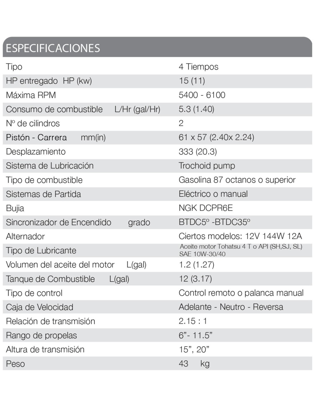 - Aceite Tohatsu 4 Tiempos / API estándar (SH,SJ,SL) / SAE 10W-30/40
